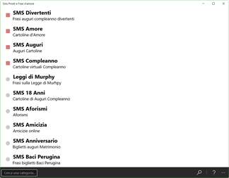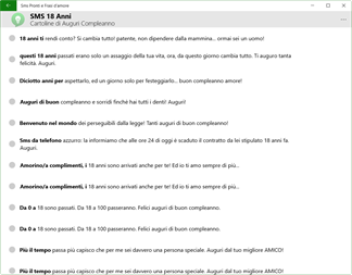 Puoi scegliere tra le oltre 40 categorie a disposizione e troverai 100 SMS tra i migliori selezionati dal sito e dall'utilizzo che ne fate. SMS divertenti, SMS d'amore, barzellette, auguri di compleanno, frasi per il buongiorno e la buonanotte... E non mancano le festività!