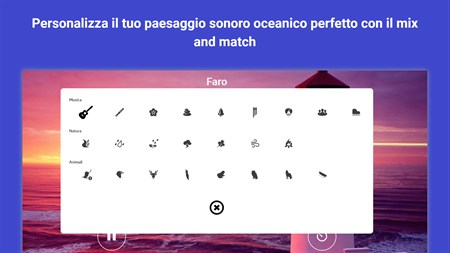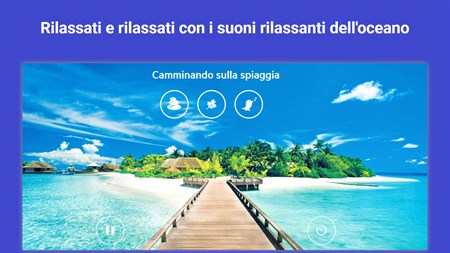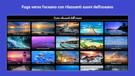 Abbiamo selezionato con cura un'ampia gamma di suoni oceanici di alta qualità per aiutarti a creare la tua esperienza di relax personalizzata. Sia che tu preferisca il dolce sciabordio delle onde su una spiaggia sabbiosa, il tonificante scrosciare dell'acqua che si infrange contro le rocce, la nostra applicazione ha tutto.