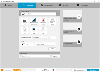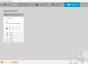 TA/UTAX Print Center è un'applicazione per le stampanti TA/UTAX che condividono una connessione di rete con computer o tablet che eseguono Windows 10 o versioni successive. L'applicazione consente di: