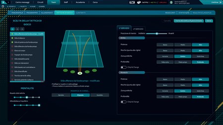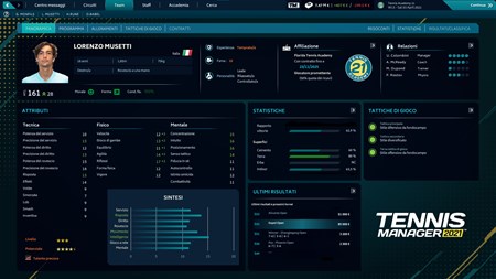 Crea la tua squadra Ogni giocatore ha un mix di punti di forza e debolezza che dovrai considerare al momento del reclutamento a durante gli allenamenti, per ottenere il meglio dagli atleti. Decine di parametri stabiliscono il comportamento dei giocatori, dentro e fuori dal campo. Stile di gioco, superficie preferita, morfologia, carattere, condizioni fisiche: tutti questi aspetti rendono ogni giocatore unico. In qualità di manager, hai a disposizione un set di strumenti analitici che ti aiuteranno a capire meglio i tuoi giocatori e a seguirne l'evoluzione nel corso del tempo.