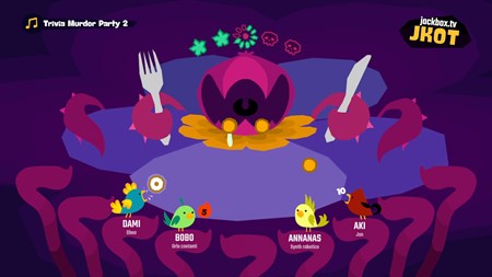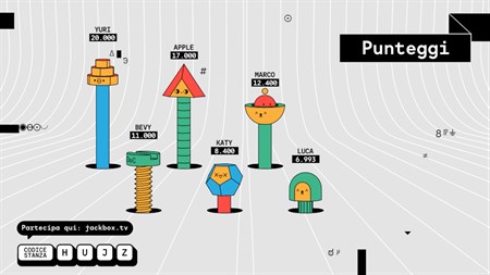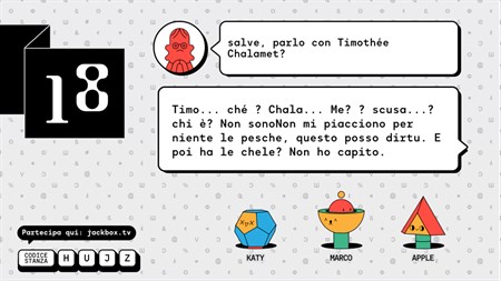Diventa una leggenda delle feste con The Jackbox Party Pack 10. Dai inizio alla tua festa Il celebre franchise fa il suo ritorno con 5 nuovi party game in 1 pacchetto esilarante. Ritrovo? Festa di lavoro? Serata con gli amici? C'è un gioco per tutti e per qualsiasi occasione, dalla strategia, al disegno, ai quiz, alla musica! Gioca con il tuo telefono o tablet: non servono controller speciali. I giochi supportano fino a 9 giocatori e 10.000 spettatori. Sei pronto a rendere le cose globali? Tutti i giochi del Party Pack 10 sono disponibili in inglese, francese, italiano, tedesco o spagnolo. Scegli il tuo gioco Tee K.O. 2 (disegno, scrittura): in Tee K.O. 2 fai ritorno alla misteriosa isola delle t-shirt, dove i guerrieri più incalliti del mondo competono in un letale torneo di combattimento. È il dito disegnatore, e non il pugno, a stabilire la vittoria! FixyText (scrittura, lavoro di squadra): FixyText è il selvaggio west delle modifiche del testo. In questo gioco caotico sono tutti nella chat di gruppo, scrivendo contemporaneamente per creare l'affermazione più memorabile. E non c'è alcun tasto per cancellare. Prendi questo, correttore automatico! Hypnotorious (identità nascosta, gioco di ruolo): Hypnotorious è un gioco con ruoli segreti, alleanze incerte e, ovviamente, risposte stupide a domande ridicole. Chi sta dalla tua parte? Timejinx (quiz): in Timejinx sei un viaggiatore del tempo proveniente dal futuro che compete in una notte di quiz ad alto rischio! Salva la tua linea temporale attuale rispondendo a domande sul passato. Dodo Re Mi (musica, lavoro di squadra): in Dodo Re Mi, il tuo telefono è il tuo strumento. Tu e il tuo stormo dovete comporre musica insieme per fuggire alla pianta della giungla affamata.
