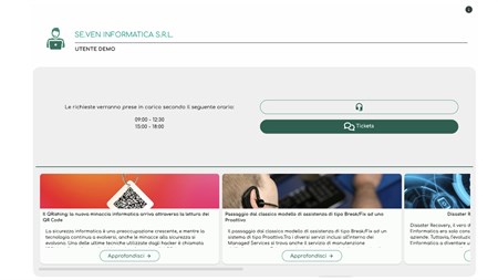 Questa applicazione è dedicata solo ai clienti di SE.VEN INFORMATICA che hanno un contratto attivo e serve ad aprire un ticket di richiesta assistenza sistemistica o software. Con l' applicazione hai anche la possibilità di allegare foto alla tua richiesta in modo che i tecnici possano capire più rapidamente il problema! Dovrai solo scaricare Ti Assisto, compilare i dati relativi alla tua ditta e all'utilizzatore della postazione. Saremo noi a verificare l'autenticità della postazione e procedere all'attivazione in maniera del tutto automatica.