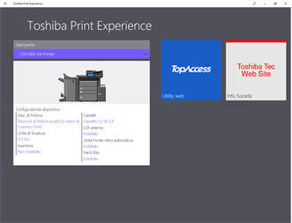 Toshiba Print Experience ("Applicazione") offre funzioni di stampa utili per il controllo delle stampanti multifunzione TOSHIBA e-STUDIO ("MFP"). Questa Applicazione consente di configurare impostazioni dettagliate per la stampa di un documento mediante le app di Windows store. L'Applicazione consente anche di consultare da remoto le opzioni di configurazione dell'MFP. Per maggiori informazioni, consultare il Menu Guida dell'Applicazione. Per utilizzare l'Applicazione, installare preventivamente il "Toshiba V4 Printer Driver" sul PC. Leggere il file "Leggimi" del driver di stampa Toshiba V4 per verificare i modelli supportati e le relative condizioni. Per utilizzare o installare l'Applicazione, accettare i termini e le condizioni dell'Accordo di licenza per l'utente finale ("EULA"). Leggere attentamente EULA prima di utilizzare o installare l'Applicazione. SE NON SI ACCETTANO I TERMINI E LE CONDIZIONI DI EULA, NON INSTALLARE, COPIARE O UTILIZZARE QUESTA APPLICAZIONE. Nota: Toshiba TEC non raccoglie informazioni personali, inclusi dati di stampa e scansioni, mediante la presente applicazione.