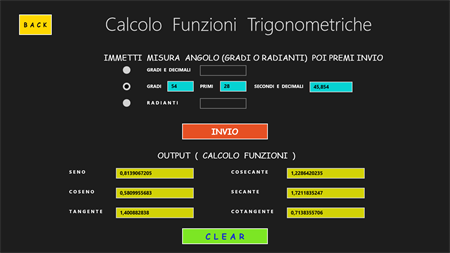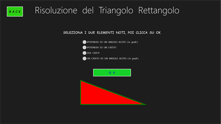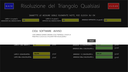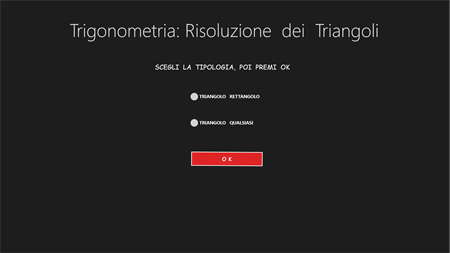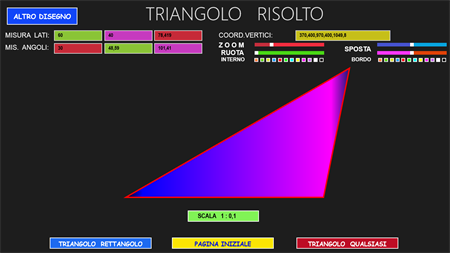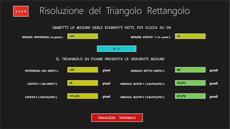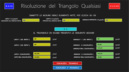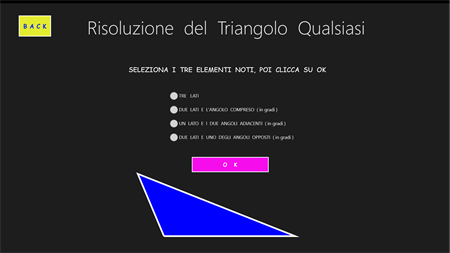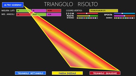 L’APP “Trigonometria Risoluzione Triangoli” consente di calcolare la misura dei tre lati e l’ampiezza dei tre angoli di qualsiasi triangolo, fornendo in input: a) solo 2 elementi, di cui almeno un lato (x triangolo rettangolo); b) solo 3 elementi, di cui almeno un lato (x triangolo qualsiasi). Una volta fatti i calcoli, visualizza l’immagine del triangolo calcolato in una scala variabile, che ne consente sempre la visualizzazione. In questa pagina, si può agire sul triangolo variandone i colori, zoomandolo, spostandolo e ruotandolo. Si viene sempre avvisati quando i dati di input non sono corretti, quando essi non danno origine ad alcun triangolo e quando danno origine a 2 diversi triangoli. In quest’ultimo caso è possibile visualizzare, una alla volta, entrambe le figure. Questa APP è molto utile agli studenti dei Licei Scientifici e agli studenti universitari (soprattutto delle facoltà di Ingegneria e di Matematica).
