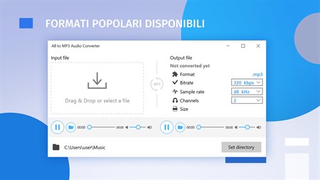 Convertitore Mp3 universale permette di: - Pre-ascoltare i file audio caricati (e trasformati) - Impostare la velocità dei file di uscita (320, 256, 192, 128 kbps) - Riprodurre su qualsiasi dispositivo dopo la conversione e ti fornisce - le informazioni sui canali audio e sulla frequenza di campionamento