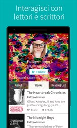 • Scegli tra più di 10 milioni di storie e libri GRATUITI: i migliori libri di fantascienza, fantasy, gialli, romanzi, fanfiction, thriller e molto di più! • Collegati con i tuoi scrittori preferiti, come Margaret Atwood, Paulo Coelho e migliaia di scrittori emergenti di tutto il mondo • Ricevi aggiornamenti di storie e libri direttamente dagli autori • Leggi non in linea e personalizza le tue impostazioni di lettura per personalizzare la tua esperienza