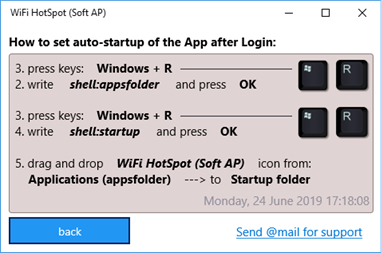 Quest'applicazione consente la creazione di un Soft-AP (Access Point) lì dove non è più possibile utilizzare la rete ospitata (Hosted Network, il cui supporto è recentemente terminato). Implementa un hotspot wireless su tutti gli adattatori supportati (in grado di supportare il Wi-Fi Direct), utilizzando l'interfaccia WDI (WLAN Device Driver Interface) per Microsoft Windows® 10. L'app consente l'avvio automatico del Soft-AP con un ritardo personalizzabile. Se impostata per avviarsi automaticamente all'avvio di Windows può quindi creare ed avviare l'hotspot in maniera del tutto automatica. Ciò è particolarmente utile per creare un Soft-AP per un PC "cieco" o per un Edge Box PC che si avvia solitamente senza schermo. SSID e password, così come le impostazioni di avvio automatico e di ritardo possono essere tutti salvati localmente e caricati automaticamente all'avvio dell'app.