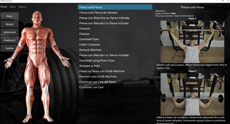1. Gli esercizi sono presi dalle nostre app: WinGym e WinGym Lite per Windows Phone. Entrambe app si successo con numerose positive recensioni( piu di 1000 in totale) ( more than 1000) e piu di 150,000 downloads. 2. Gli esercizi sono fatti con il supporto di allenatori professionisti, e ti permetteranno di aumentare il tuo rendimento in palestra. 3. L'interfaccia é semplice e non é noiosa. :-) 4. Assolutamente gratuito. Noi lavoriamo per le recensioni. :-) Non ci sono noiose pubblicità e immagini che indirizzano all'acquisto di altre app.