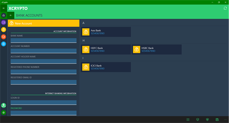 SECRET PASSWORD: Using xCrypto you can keep a record of your Application Accounts, Bank Accounts, Debit/Credit Card Accounts and Website accounts and encrypt them with single Secret Password which will only password you will need to remember.