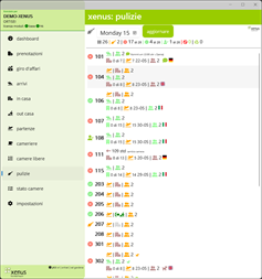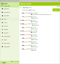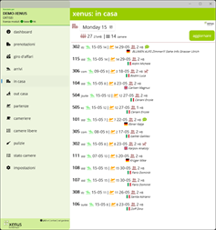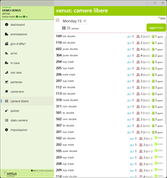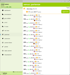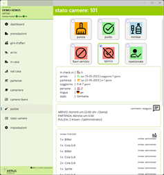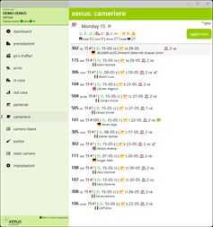 - Liste: è disponibile una varietà di liste, sempre sincronizzate con xenus-hotelsoftware. Grazie a ciò, gli utenti hanno sempre una visione dell'intera situazione in albergo. - Lista di arrivi degli ospiti - Elenco degli ospiti in casa - Lista partenze degli ospiti - Gestione pulizia camere: Per le cameriere ai piani è disponibile un elenco interattivo delle pulizie da eseguire. Entrando nella stanza, la reception viene informata dello stato della camera tramite i tasti Pulizia, Pulito, Sporco, Fuori servizio, ecc. Le bevande del minibar possono essere addebitate direttamente sul conto dell'ospite. - Il direttore dell'albergo ha una panoramica completa delle camere pulite e del tempo necessario per fine la pulizia. Ciò consente di rendere le pulizie molto più organizzate.