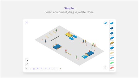 Select equipment, drag it into the gym, arrange, rotate and save. The hall plan is ready.