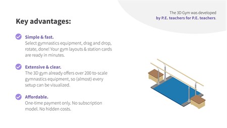 Extensive: The 3D gym already offers over 200 true-to-scale gymnastics equipment, materials & figures, with which you can create countless setups.