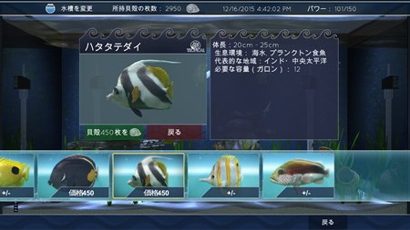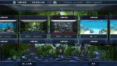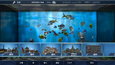 水槽を選択し、フロア、壁紙、デコレーションを変更し、望み通りの水槽を作りましょう。もちろん魚もお忘れなく。