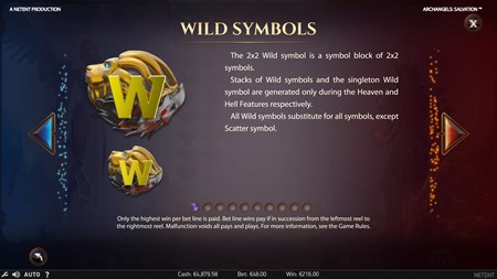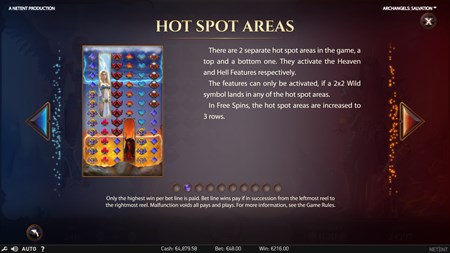 The game consists of special Wild and the Scatter symbols, as well as its distinct features, namely the Hot Spot Areas. These are found at the top and at the bottom of the reels, which both trigger the Heaven and Hell features whenever 2x2 Wild symbols land in these areas. If the 2x2 Wild symbols land fully or partially at the top Hot Spot Area, the Heaven Feature is activated. If the 2x2 Wild symbols land partially, two stacks of Wild symbols are generated. If they land fully, four stacks of Wild symbols appear. Similarly, if 2x2 Wild symbols land at the bottom Hot Spot Area, the Hell Feature is activated which awards singleton wilds. The number of singleton Wild symbols generated is either 8 or 16, depending on whether the 2x2 Wild lands partially or fully in the Hot Spot Area.