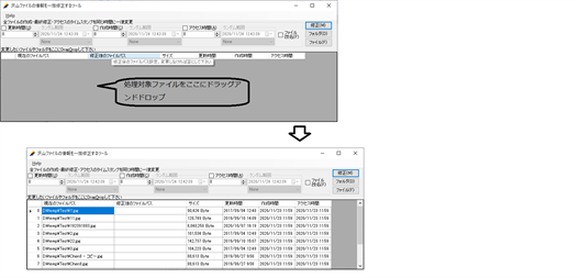 時々、多数のファイルのファイル名やタイムスタンプを変更する必要があります。 変更するファイルの数が少ない場合ならエクスプローラーで何とかなりますが、 数が多くなると、エクスプローラーで直接に変更するのは大変不便となります。 また、選択した複数のファイル名をエクスプローラーから取得するがあります。しかし、この取得は意外に簡単ではありません。 このような場合は、このツールがこれらの問題の解決に役たちます。 複数のファイル名、ファイル作成時間、最終アクセス時間、最終変更時間を簡単に変更できます。 また、ファイルブラウザの「送信先」を介して、選択した複数のファイル名をクリップボードにコピーすることもできます。