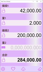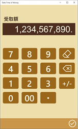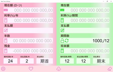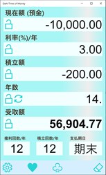 複利及び単利計算(預貯金/ローン等)を行うアプリです。ファイナンシャル電卓の [PV][FV][PMT][I%][N] キーと同等の計算をします。 タッチパネルに適したユーザーインターフェイス(表示数字自体に直接触れる事で数値入力・修正、結果入力切り替えができる)を備えています。 Surface Pro、2in1 PC 等使用される方は是非お試しください。 (マウス、タッチパッドでもダイレクト感が薄れるだけで操作は可能です。)