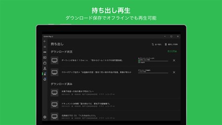 ・パソコンにダウンロードして視聴「持ち出し」 テレビやレコーダーで録画した番組を、パソコンにダウンロードして視聴できます。録画番組を持ち出すことで、家の中だけではなく、電車や飛行機の中でも録画番組を楽しむことができます。 ※バックグラウンドでの持ち出し機能のため、別途、拡張モジュール「ダウンロード/WOLモジュール」のインストールが必要になります。 ※MPEG-2 ビデオの再生を実現するため、別途Microsoft Storeより、拡張モジュール「MPEG-2 ビデオ拡張機能」のインストールが必要になります。 ※拡張モジュールは無料です。詳細はアプリ内の説明をご確認ください。