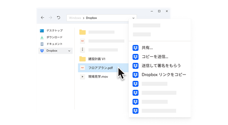 - ウェブ版よりも高速で Dropbox にファイルをアップロード - デスクトップから直接すべてのコンテンツにアクセス - パソコンのローカル ファイルを Dropbox に移動し[オンラインのみ]に簡単に設定して、ハード ドライブの空き容量を節約 - PC のタスクバーにある Dropbox アイコンをクリックすることで、アップロードステータスと最近のファイル アクティビティを表示 - ファイルを右クリックすると、署名、署名用に送信、バージョン履歴の表示などが、すべてデスクトップから直接実行可能