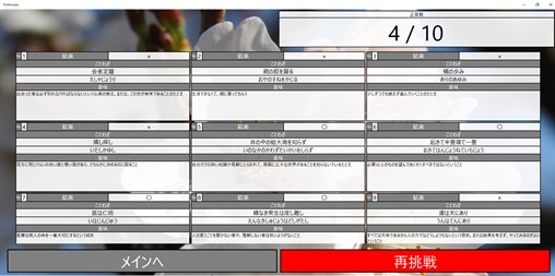 何度か問題を解いていくと【書き取り】問題や難度の高い問題も選択できるようになります。 また、【辞典】モードや解答画面では、それぞれのことわざのWeb検索がボタン一つでできるので、使用例なども簡単に検索することができます。