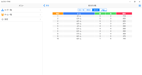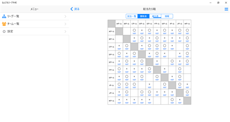 ■総当たり戦 各チームが他の全チーム試合を行います。 ・最大20チームまで参加 ・5巡まで繰り返し可能 ・同じ順位の場合は直接対決