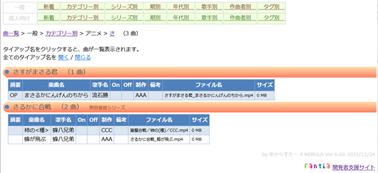 ゆかりすたー 4 NEBULA(ネビュラ)はカラオケ字幕動画ファイル(ニコカラ)を整理し、見やすくリスト化します。ファイル名から得られる情報に加え、楽曲情報データベースも活用することにより、カテゴリー別(アニメ、ゲーム等)・歌手別・年代別など、多彩なリストが作成されるため、目的のカラオケ字幕動画ファイルを見つけやすくなります。