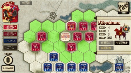 1805年12月、アウステルリッツ郊外のプラッツェン高地にて、ナポレオンとオーストリア・ロシア連合軍が戦いました。この会戦をヘクスとダイスを用いたシステムで再現。プレイヤーは各陣営の司令官として戦力ユニットを操作し、移動・戦闘を繰り返す事で当時の戦いを指揮します。特に騎兵部隊の突撃タイミングは重要です。