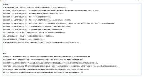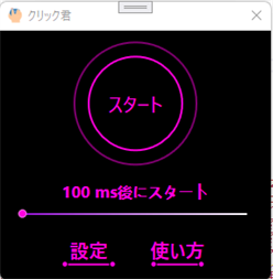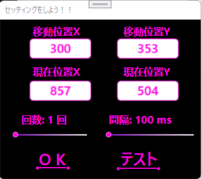 ・使用方法 ①フォーム(操作画面)左下の「設定」からクリックする座標とクリックする間隔、クリックする回数を設定して「OK」ボタンを押して下ださい。 設定画面説明(フォーム左下の「設定」をクリック):クリックする座標はフォーム(操作画面)左上の「移動位置X」(画面横方向)とフォーム(操作画面)右上の「移動位置Y」(画面縦方向)に入力してください。 設定画面説明(フォーム左下の「設定」をクリック):「現在位置X」と「現在位置Y」は現在のポインタの座標を表示しています。 設定画面説明(フォーム左下の「設定」をクリック):「回数:」ではクリックする回数を設定できます。 設定画面説明(フォーム左下の「設定」をクリック):「間隔:」ではクリックする間隔を設定できます(1 msは、0.001秒で、1000 msで1秒です)。 設定画面説明(フォーム左下の「設定」をクリック):「回数:」と「間隔:」はスライダーをスライドさせる他にキーボードの右矢印ボタン(→)と左矢印ボタン(←)で細かく調整できます。また、スライダーを1クリックすることで大きく調整できます。 設定画面説明(フォーム左下の「設定」をクリック):フォーム(操作画面)右下の「テスト」ボタンを押すことで設定した座標を一回クリックします。 設定画面説明(フォーム左下の「設定」をクリック):フォーム(操作画面)左下の「OK」ボタンを押すことで設定を完了できます。 ②フォーム(操作画面)真ん中のスライダーでフォーム(操作画面)上の「スタート」ボタンを押した後、何秒後に動作を開始する設定します。 ③フォーム(操作画面)上の「スタート」ボタンをクリックすると設定画面で設定した座標のクリックを開始します。 ④フォーム(操作画面)上の「ストップ」ボタンをクリックすると途中で中止することができます。 ⑤フォーム(操作画面)上のボタンの表示が100 %になると(設定した動作が完了すると)「終わりました」という画面が新たに表示されるので「OK」を押してください。