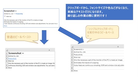 クリップボードのコピー&ペーストを繰り返すき、色やフォントサイズなどの書式が煩わしいことはありませんか? 「シンプルクリップボード!」は、クリップボードから、色やフォントサイズなどの書式を取り除きます。 どんなアプリケーションからコピーしても、単純なテキストとして、クリップボードに保管されます。