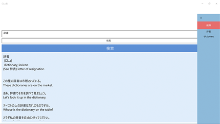 Windows 10版 登場! じしょ君は様々な辞書の検索エンジンを使った国語辞典・英和辞典・和英辞典の検索ツールです。使い方は簡単です。調べたい単語を入力し、辞書の種類(国語・和英・英和・英英・類語・反対語・翻訳)を選択して、検索ボタンを押すだけです。