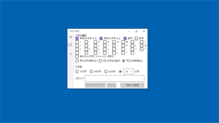 あらかじめ設定した文字を使用してパスワードを生成するアプリです。 特徴 ・文字数は、8文字から24文字までのパスワード生成ができます。 ・同一文字は、「同じ文字を使わない」、「同じ文字は1回まで使う」、「同じ文字制限なし」から選べます。 ・紛らわしい文字「1(いち)、0(れい)、l(小文字エル)、o(小文字オー)、I(大文字アイ)、|(バーティカルバー)」を除外したパスワード生成ができます。 ・記号については、個別に選択することができます。 ・生成されたパスワードはクリップボードにコピーすることができます。 ※このアプリには、生成されたパスワードはコピーされませんので、メモを取っておくなりご自身でパスワードを保管のほどお願いいたします。