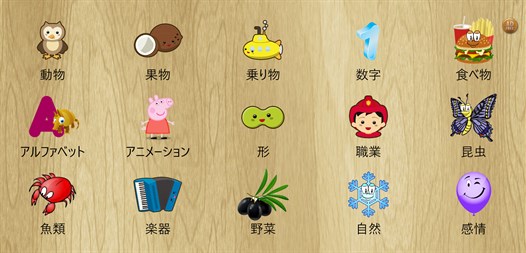 * 動物 : リス、パンダ、ミツバチ、サル、ニワトリ、アヒル、ペンギン、ゾウ、ライオン、フクロウ、犬、その他のかわいい動物。 * フルーツ : パイナップル、レモン、リンゴ、イチゴ、バナナ、チェリー、ナシ、スイカ、ココナッツなど * 野菜 : にんじん、とうもろこし、こしょう、大根、なす、カリフラワー、黒オリーブ、キャベツ、唐辛子など * 数字 * アルファベット *昆虫 * 食品 * 魚 *車両 *漫画 * 形状 * 職業 *楽器 * 自然 *感情