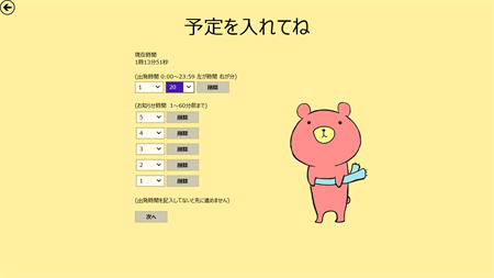 登場キャラクターであるクマが予定管理をしてくれます。出発時間とお知らせ時間を登録すると、クマがかわいくお知らせしてくれます。また、外出時に持っていくものも同時に登録できます。まず、トップページから予定を頼むを押すと予定入力画面に移ります。出発時間、お知らせ時間を入力して次に進みます(出発時間は必須です)。お知らせ時間は出発時間の60分前まで登録できます。次に持っていくものを記入します。持っていくものは最大10文字までのものを最大8個まで登録できます。予定確認画面で次へを押すと登録した出発時間、お知らせ時間、持って行くものが登録され、指定した時間にトーストが行われるようになります。登録が終わるとTop画面に戻ります。Top画面から予定を確認するを押すと登録した予定を確認することが出来ます。予定を確認する画面では出発時間までの残り時間、お知らせ時間、持って行くものが表示されます。持って行くものの右側にあるチェックボックスにすべてチェックをつけて出発ボタンを押すと出発確認画面に移ります。出発確認画面では、登録した出発時間より早く出発したか遅く出発したかでクマのコメントが変わります。一度予定を登録した後で新たに予定を登録しようとすると以前の予定をは削除されます。予定を削除すると、以前の予定をそのまま使うかどうかを聞かれます。そのまま使うを選択した場合以前登録した予定をそのまま使え、そのまま使うを選択しなかった場合、最初から新たに予定を入れることが出来ます。スナップ表示では出発までの残り時間が表示されるようになっています。