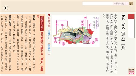 ã€è¾žæ›¸ã‚’調ã¹ã‚‹ã®ã«ä¾¿åˆ©ãªæ©Ÿèƒ½ã€‘ ・検索æ¡ä»¶ã¯ã€Œèªžé ãŒä¸€è‡´ã€ã€Œèªžå°¾ãŒä¸€è‡´ã€ã€Œä¸€éƒ¨ãŒä¸€è‡´ã€ã€Œå®Œå…¨ä¸€è‡´ã€ã€Œæœ¬æ–‡ã‚‚検索ã€ã®5種類。 ・五å音や和æŒãƒ»ä¿³å¥ã‹ã‚‰é¸ã¶ã ã‘ã§èª¿ã¹ã‚‹ã€Œç´¢å¼•検索ã€ã¯ãƒžã‚¦ã‚¹ã¾ãŸã¯ã‚¿ãƒƒãƒæ“作ã ã‘ã§èª¿ã¹ã‚‹ã“ã¨ãŒã§ãã¾ã™ã€‚å¤å…¸å¦ç¿’ã«å½¹ç«‹ã¤ã€Œèªè§£ã®ãŸã‚ã®ä¸€è¦§ã€ã€ã€Œã¾ãŽã‚‰ã‚ã—ã„語ã®è˜åˆ¥ã€ã‚‚索引検索ã§èª¿ã¹ã‚‹ã“ã¨ãŒã§ãã¾ã™ã€‚ ãƒ»é …ç›®ã«ä»˜ã‘る「ãµã›ã‚“ã€ã¯èµ¤ãƒ»ç·‘・é’・黄ã®4色。 ・å˜èªžã‚„æ–‡ç« ã«ä»˜ã‘る「マーカーã€ã¯èµ¤ãƒ»é’・黄ã®3色。