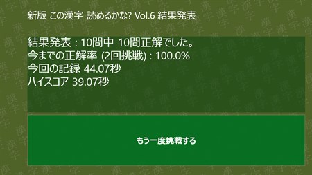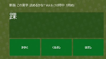 難読漢字を出題します。第6弾は身体に関係した漢字を出題します。10問中、何問正解することができるでしょうか? 新版では、出題される問題が毎回変わります。選択肢の位置も変わります。 さらに、全問正解した場合は要した時間が記録され、ベストタイムが表示されます。 通算の正解率も表示されるようになりました。