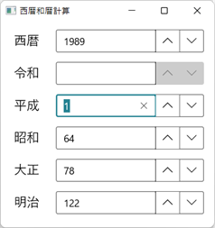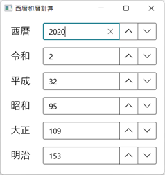 西暦を和暦に、和暦を西暦に、変換します。 和暦は、令和、平成、昭和、大正、明治に対応しています。
