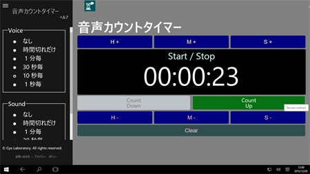 このアプリは、音と声でカウントするタイマーです。 時間を設定してのカウントダウンとカウントアップに対応し、経過時間を聞きながらのカウントアップは、特に便利です。 直観的で、簡単な操作を実現しています。