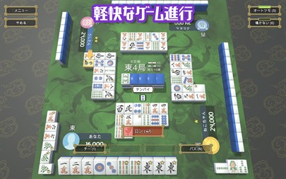 役読み上げ機能付き、四人打ちコンピュータ対戦麻雀ゲームです。 イカサマ無し、フリテンが警告されるのでチョンボ無し。 麻雀の基本ルールや役などを参照できるヘルプがあります。 和了率、リーチ率、副露率、放銃率などの成績表機能。 テンパイ、アガリ、役が無いことなど警告を表示。 詳細な点数計算表示。 喰いタン、赤牌、箱割のオン、オフ機能。 ゲームの長さは、一荘戦、半荘、東風戦の3種類から選べます。 コンピュータプレーヤーの名前と声を変更可能。