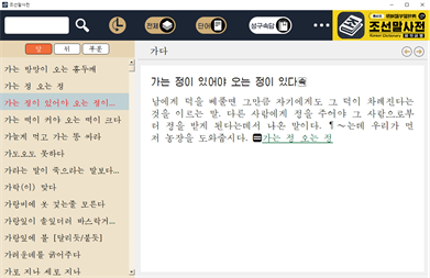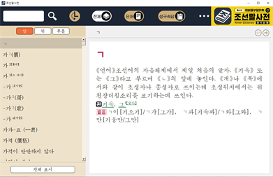 6. 편리하고 빠른 검색, 《링크》기능 - 검색방향 《앞 / 뒤 / 부분》, 검색범위 《전체 / 단어 / 성구속담》 설정 - 동의어, 류의어, 반의어 등의 련관어정보는 《링크》로 해당 올림말에 안내 - 올림말을 종이사전을 펴보듯이 찾을수 있게 자모음별로 올림말목록을 표시