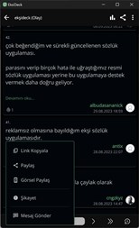 - Android share menu. Selecting a text from other applications and choosing "share -> EkşiDeck" brings up the search results of the title in Ekşi Sözlük.