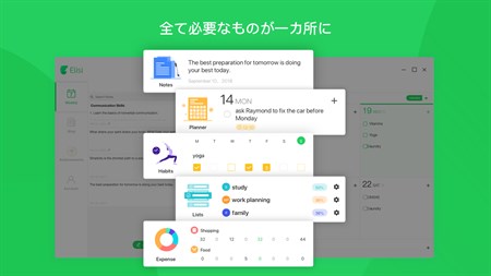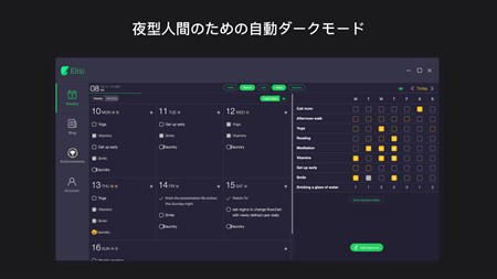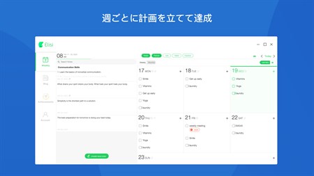 「Elisi」は、生産性と個人目標達成のためのワンストップショップです。やるべきこと、記録すべき習慣、必要なメモなど、明確に示された1週間の予定を1つのアプリですべて確認しましょう。シンプルで直感的なUIにより、簡単に準備を整え、あらゆることを計画どおりに進めることができます。