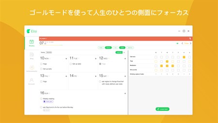 - 目標 習慣、リスト、作業、メモなど、同じ目標に関連するあらゆることをまとめましょう。目標モードで、「Elisi」は、長期の取り組みをサポートすることができるツールに変わります。