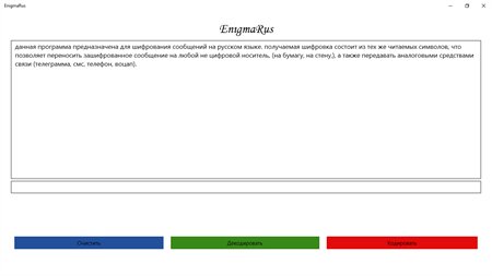 Данная программа предназначена для создания зашифрованных записок. Благодаря тому, что полученная шифрограмма состоит из обычных букв и символов, она может быть перенесена на любой не цифровой носитель (бумагу, стену, парту), продиктована по телефону, переслана в СМС, WhatsUp, Viber. Оставляйте своим друзьям секретные послания, шифруйте свои заметки, играйте в шпионов. Используйте свой, уникальный ключ для шифрования, состоящий из цифр, чтобы защитить информацию.