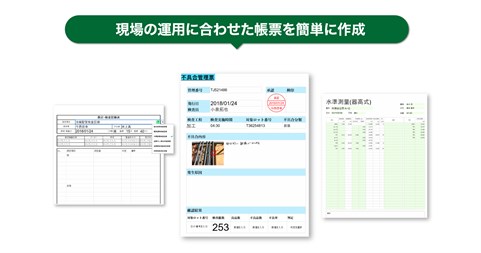 ●帳票の作成環境、表計算機能を搭載 ・フォーム部品を貼り付けるだけで、紙の帳票と見た目そのままの帳票を簡単に作成できます。 現場の運用に合わせて現場の担当者がカスタマイズすることもできます。 ・自動計算可能な表を貼り付けた「出面表」「測定・検査記録表」や 自由に手書きできる「現場巡視記録」などの業務テンプレートや「黒板」「現場看板」など よく使うアイテムを多数搭載しています。 報告書を現場で作成し、効率的に業務を行うことができます。