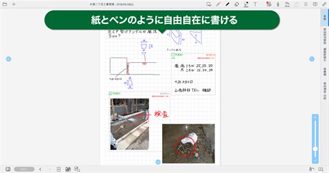 ●紙とペンのように自由自在に書ける ・文字や絵をスイスイ書けるので、忙しい現場でもすばやくメモすることができます 写真や動画、PDFの上にもメモや指示を書き込めます ・図形ペンを使うと手書きの線がシャープに描かれ、図形をより美しく仕上げることができます。