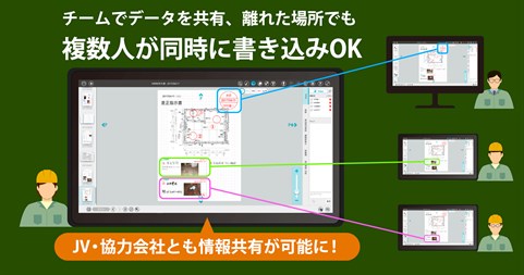 ◎離れた場所での簡単確実な意志疎通 ・複数人が現場の情報を同時に書き込める共有ノートを作成 ・現場の状況をリアルタイムに所長に報告