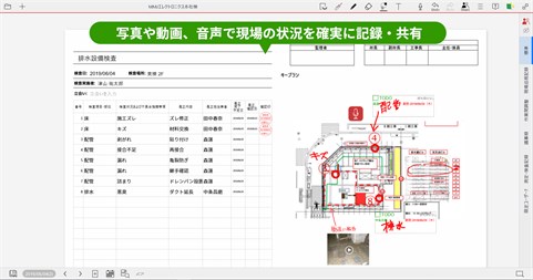 ●現場の「今」をすばやく確実に記録 ・現場の状況を写真や動画に撮ってノートに貼り付けることができます。 全天球画像にも対応しています。 ・録音しながらメモをとると、メモを書いた時点の音声から頭出し再生できます。