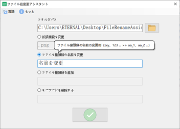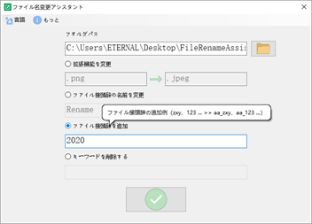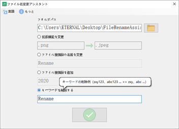 ファイル接頭辞の追加、例(zxy、123 ... >> aa_zxy、aa_123 ...) キーワードの削除、例(zxy123、abc123 ... >> zxy、abc ...) ファイルプレフィックスの名前を変更する例(zxy、123 ... >> aa_1、aa_2 ...) 拡張子を変更する例(.png >> .jpg; .doc >> .docx)