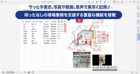 ◎「待ったなし」の現場で業務品質の向上、ミスの削減に貢献! ・手書きはもちろん、写真や動画、音声ですばやく確実に記録 ・すべての情報を日付で管理、直感的なTODO管理で業務のやり忘れを防止