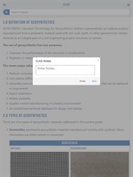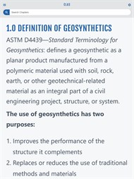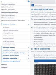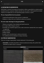 The Geosynthetic Mobile Application is a series of pocket guides combined for federal, state, and local agency highway construction and maintenance staff in the installation and construction inspection of geosynthetic applications. These guides are provided by the Federal Highway Administration (FHWA), Federal Lands Highway Coordinated Technology Implementation Program (CTIP), and the geosynthetics industry. This guide was developed by the Geosynthetic Materials Association (GMA) under contract with the FHWA. These guides are intended for use by construction inspectors, managers, and maintenance staff members. For in-depth information, refer to Geosynthetic Design & Construction Guidelines, Publication No. FHWA NHI-07-092.Non-Binding Content: The contents of this application do not have the force and effect of law and are not meant to bind the public in any way. This application is intended to serve as a quick guide for information on the types and function of geosynthetic materials, specification requirements, and site inspection guidance for walls, slopes, pavements, erosion control and drainage.