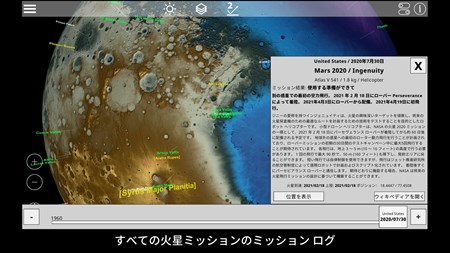 GlobeViewer Mars は、火星の全表面のインタラクティブな 3 次元地球儀です。 3D グローバル マップには、さまざまな地表地物のすべての公式名称が表示されます。 特定の地域に興味がある場合は、さらに高解像度のローカル 3D マップ ビューを読み込んで、クレーター、山、その他の地層を詳しく見ることができます。 さらに、1960 年以降のすべての火星ミッションのミッション ログが含まれています。